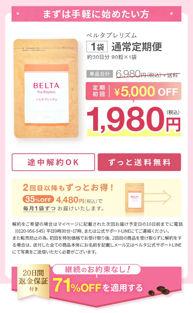 【解約について】解約をご希望の場合、マイページに記載された次回お届け予定日の10日前までに、電話(0120-956-545)平日9時30分〜17時、または公式サポートLINEにてご連絡ください。また転売防止の為、初回を特別価格でお受け取り後、2回目の商品を受け取らずに解約をする場合は、送付した全ての商品本体にお名前を記載しメール又はベルタ公式サポートLINEにて写真をご送信いただく必要がございます。