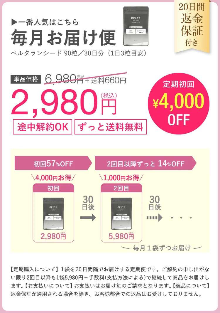 ご解約は次回お届け予定日の10日前までにベルタ公式ショップ(0120-956-545)平日9時30分~17時またはベルタ公式サポートLINEにてお手続きください。