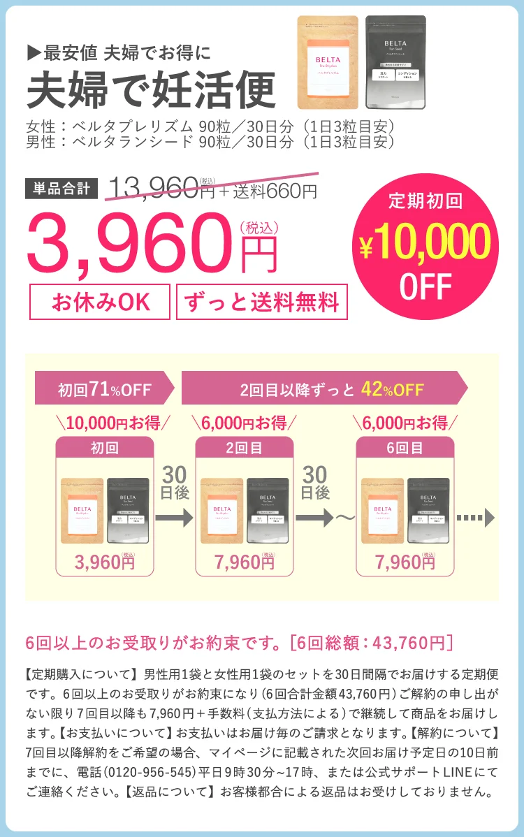 ご解約は次回お届け予定日の10日前までにベルタ公式ショップ(0120-956-545)平日9時30分~17時またはベルタ公式サポートLINEにてお手続きください。